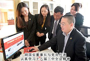 黨的十八屆三中全會勝利閉幕后,綠之韻集團(tuán)黨總支部、團(tuán)支部迅速行動起來,認(rèn)真學(xué)習(xí)、理解、領(lǐng)會和實踐“十八屆三中全會”精神,在集團(tuán)公司迅速掀起學(xué)習(xí)貫徹““十八屆三中全會”的熱潮。