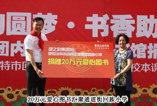 孩子是祖國的花朵,書是祖國的未來。在這個信息量巨大的社會,孩子的求知欲望從簡單的課本知識已經(jīng)延伸到生活的各個知識層面。臨近“六一”,內(nèi)蒙古呼和浩特市回民區(qū)通道街回族小學(xué)的孩子們收到了一份沉甸甸的兒童節(jié)禮物——“綠之韻集團(tuán)內(nèi)蒙古愛心圖書館”正式在這里落戶。2013年5月31日,綠之韻集團(tuán)將價值20萬元的愛心圖書送到了通道街回族小學(xué),為孩子們送去了寶貴的知識財富,也為他們打開了一扇“希望之窗”。綠之韻集團(tuán)市場營銷中心(中國區(qū))副總經(jīng)理諶獻(xiàn)軍、市場營銷中心(中國區(qū))市場總監(jiān)劉維利、綠之韻集團(tuán)內(nèi)蒙古分公司經(jīng)理侯立新、綠之韻集團(tuán)國際商學(xué)院特聘講師李娜、邵亦冉,以及內(nèi)蒙古經(jīng)銷商發(fā)展委員會王連坤、郝建兵、張聞英、張聞華、喬桂英等20多位委員出席了活動。